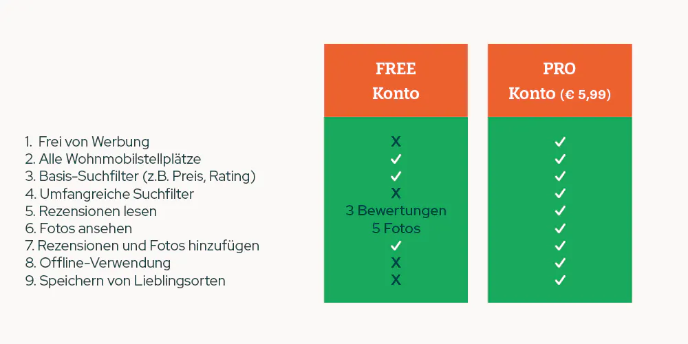* Einige Funktionalitäten sind nur für PRO-Benutzer verfügbar. Sie können die Vollversion in der App kaufen. Für nur 5,99 € profitieren Sie ein ganzes Jahr (12 Monate) von folgenden Extravorteilen: eine App ohne Werbung, Speichern Ihrer bevorzugten Wohnmobilstellplätze, Offlinemodus in der App und schnellere Suche mit den extra Filteroptionen.