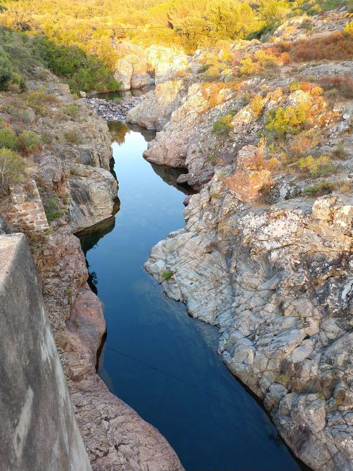 Zufahrt über schmale Straße und schmale Brücke. Nicht für große Wohnmobile geeignet - Lage direkt am Fango mit Zugang zu den schönen Badepumpen - Schatten - enge Parzellen unter Bäumen - Restaurant - Croissants und Baguette am Morgen - Zentrum 5km