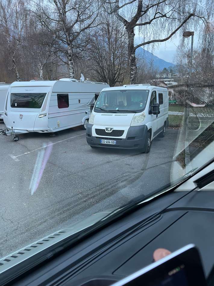 parking voor de camping bij het Haller Freischwimmbad - restaurant - winkel 300m - centrum 400m