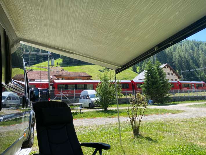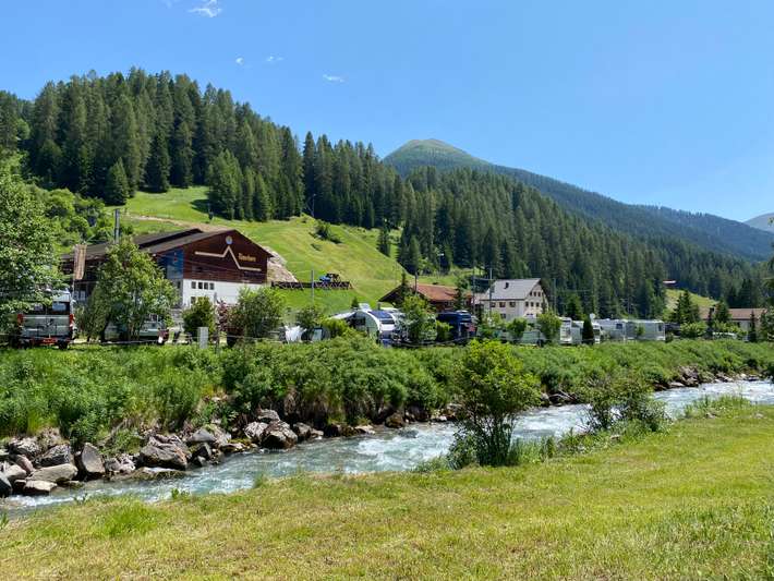 Campingplatz südlich von Davos unter der Rinerhornbahn - GPS-Koordinaten verwenden - Fluss auf der einen Seite und Bahn auf der anderen Seite des Platzes - Zentrum 7km