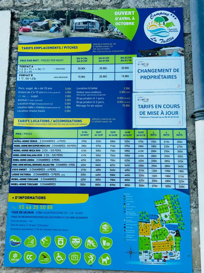 Excellent campsite, all amenities are there, including a swimming pool. We paid €17 for a place for two without electricity.