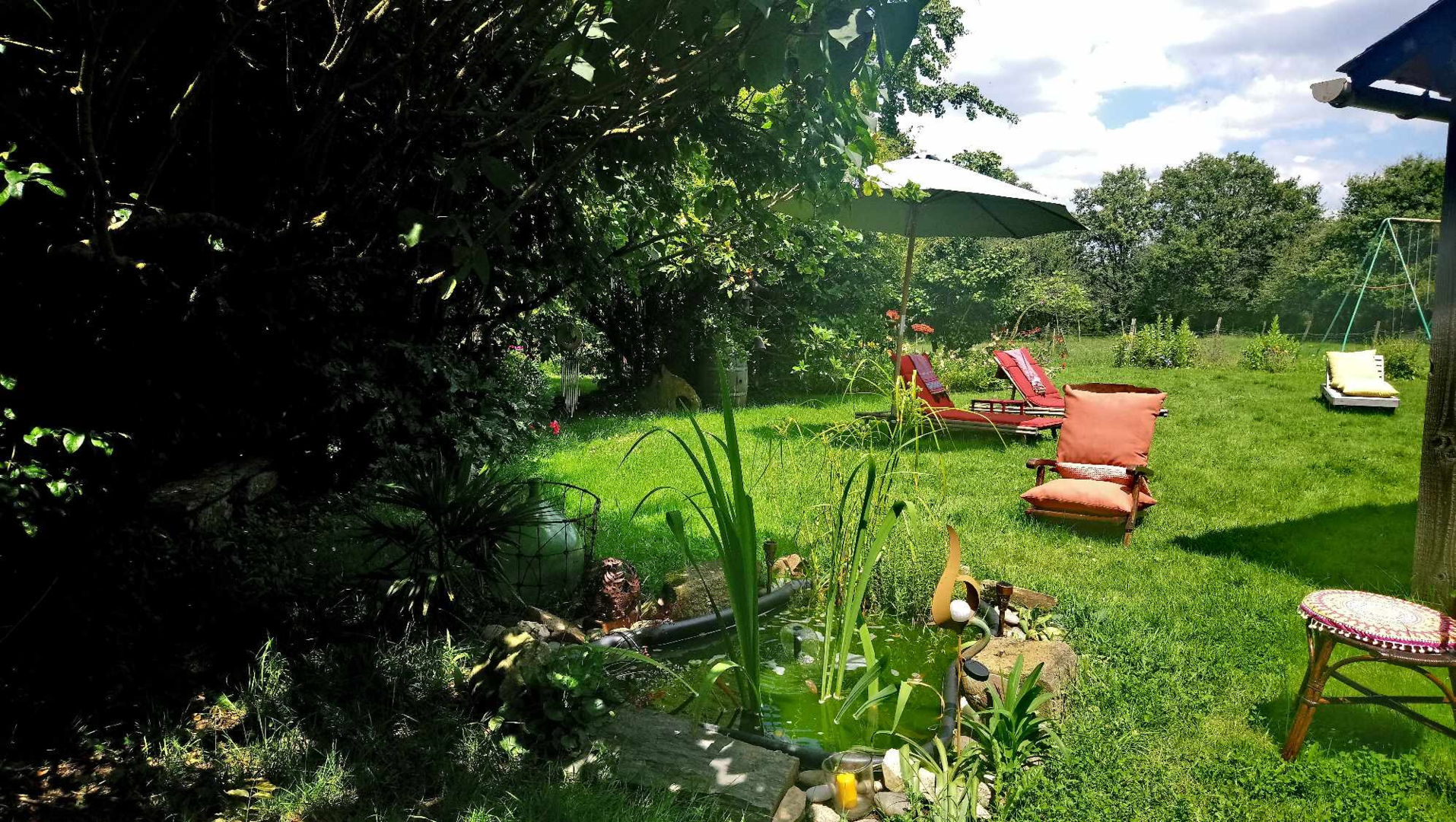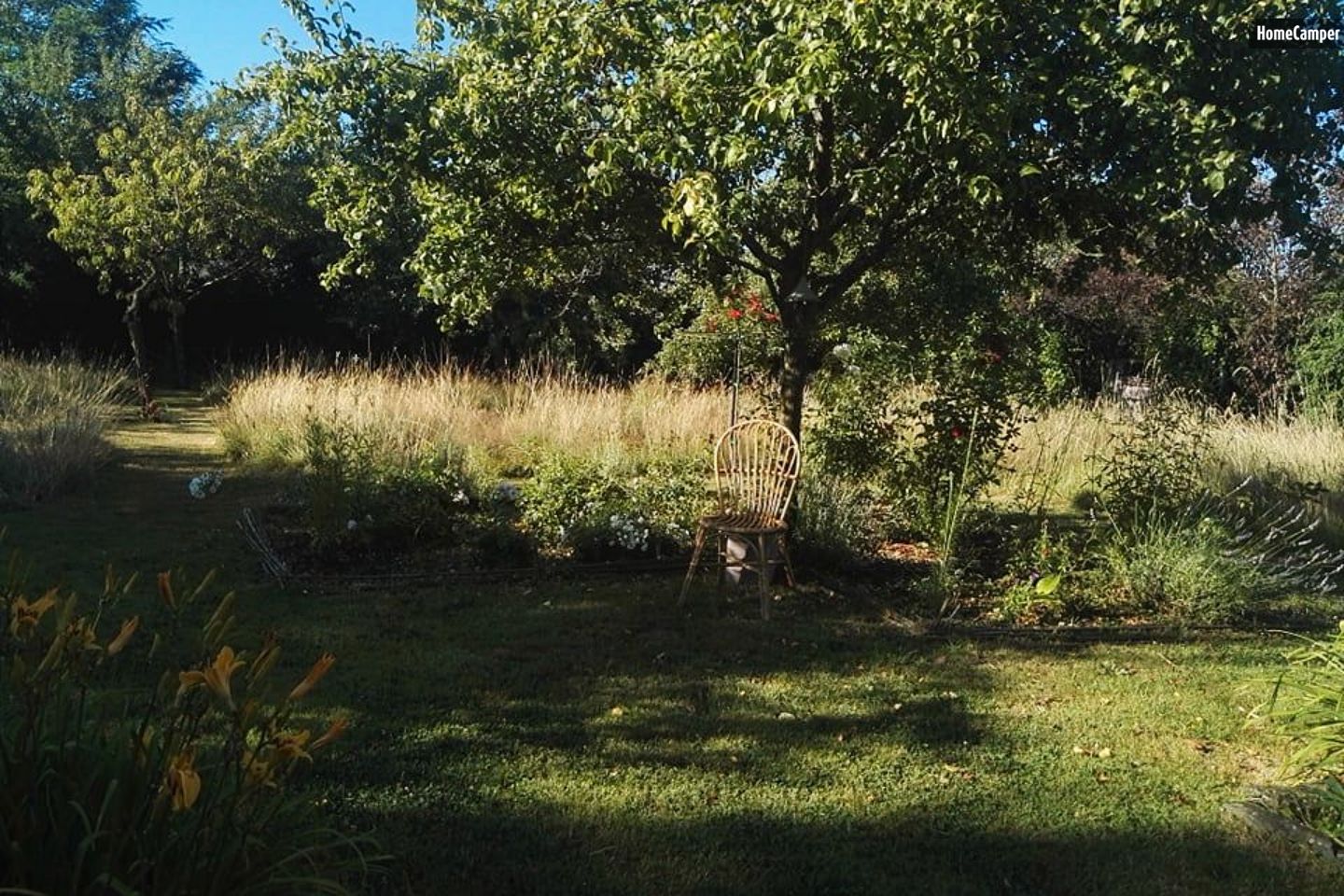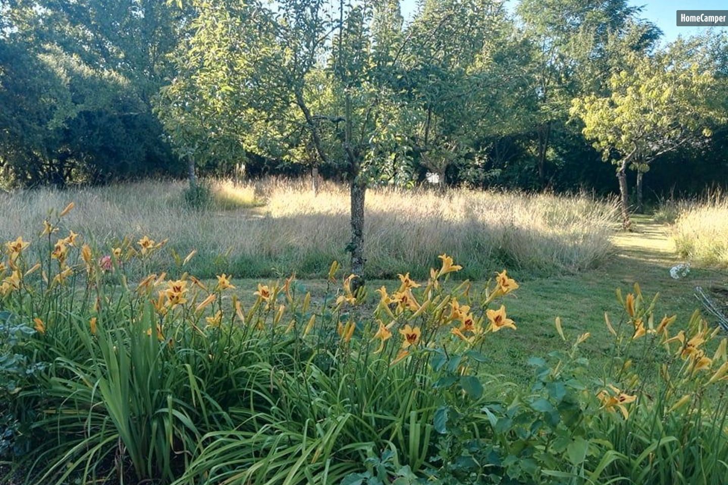 Camping in the countryside in a haven of greenery and calm, recharging your batteries and being in harmony with unspoiled nature. Our garden welcomes you to camp in the bocage at the end of a cul-de-sac, with no overlooked neighbors, surrounded by meadows and hedges. No traffic, no artificial light. Very calm, green, areas of the garden are landscaped and other areas are wild, left to biodiversity. A small wood provides coolness in case of a heatwave, two fields of more than a hectare each for observing the stars or lying in the sun, a vegetable garden with its greenhouse, an orchard, a small pond with frogs. With no traffic, it's ideal for children who will find spaces to run around or rest in the grass and wildflowers, wild animals to observe (lizards, insects, birds) and our animals to visit in complete safety (horses, chickens, goats). Ideal for recharging your batteries in peace and privacy. We look forward to meeting you in our haven of tranquility, for an immersion in our magnificent garden, to recharge your batteries. Activities Bowling green, children's play frame. In the fields, you can listen to the birds singing, dream under the magic of the stars, light a campfire. You can relax in peace, read, paint, play (board games available), visit the animals (horses, chickens, goats), and visit the vegetable garden. The city of Nantes is close by: cultural visits, shopping... (public transport 5 km away). The canal, 6 km away (Terrier Lock), offers numerous activities, including a guinguette and the immense Gâvre forest (fishing, bird watching, hiking and cycling). Trails lead directly from the house. We will lend you a map. Indoor and outdoor swimming pools nearby. Markets and organic produce are nearby. I also teach crochet and cooking classes to children and adults. As a retired teacher, I also offer childcare (games, cooking, crafts, etc.). BATHROOMS: Dry toilets under a tent, cold shower with well water, and a solar-powered hot water shower available for loan, all surrounded by a screen in the garden. Showers in the house are available for €1 per person.