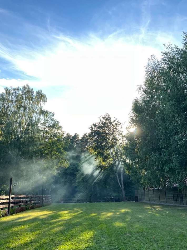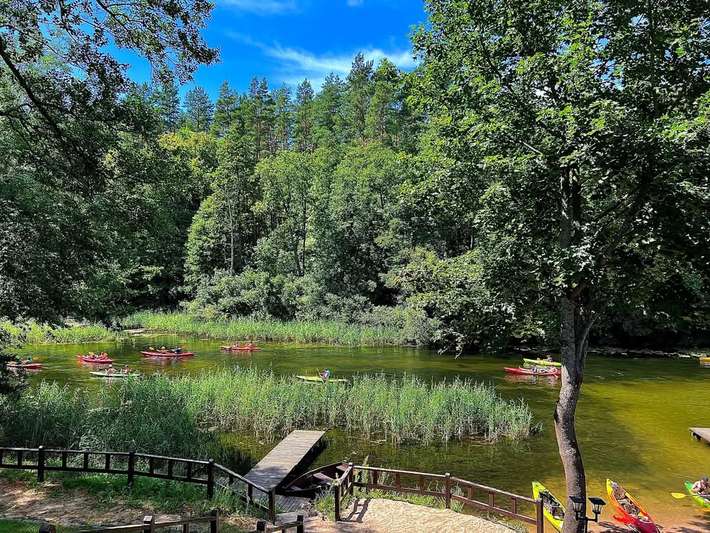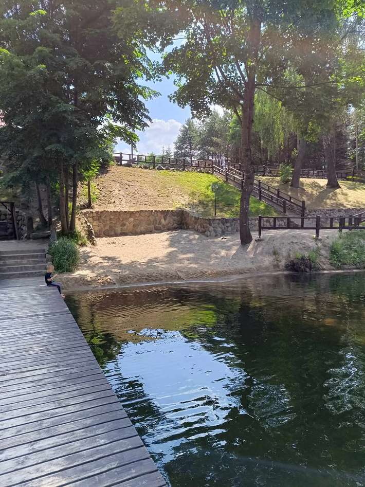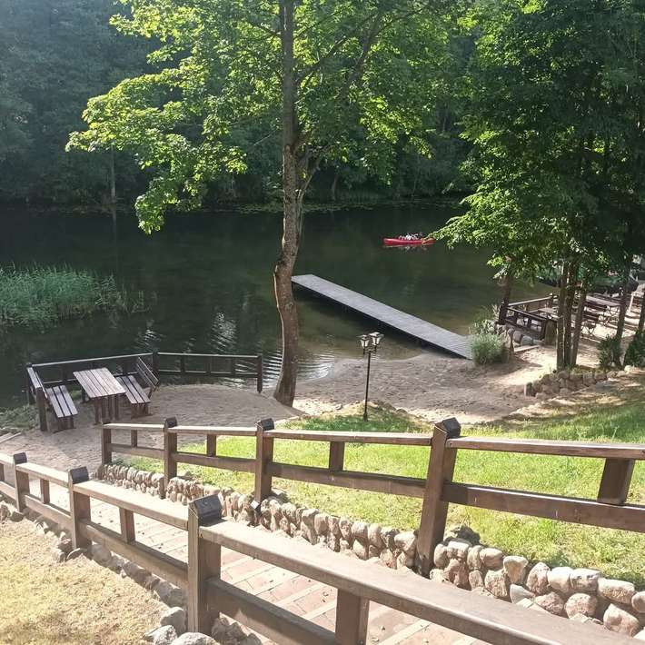 Camper site in the Masuria region directly on the Krutynia River with a private beach and a pier - covered gazebo, garden furniture, sun loungers, a barbecue area and a fire pit.