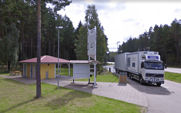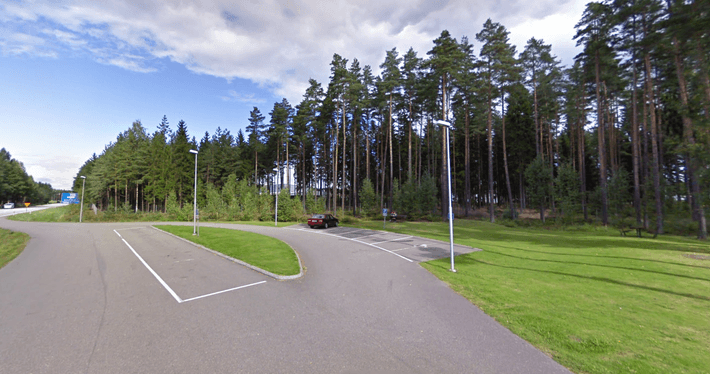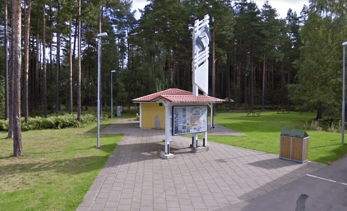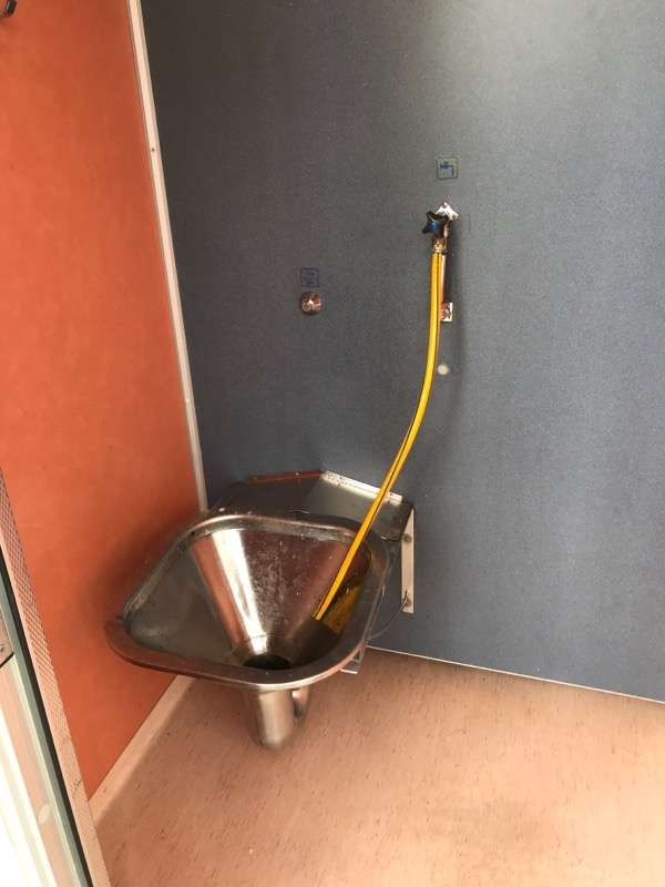 Área de descanso con mesas de picnic: grifo de agua en el costado y servicio en la parte posterior del bloque del inodoro