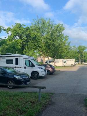 Parking avec arbre d'ombrage sans réserve de Womo spéciale. Tram au centre.