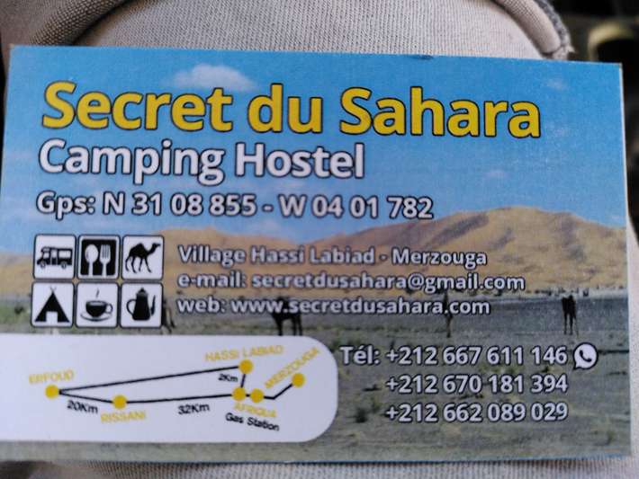 ouvert en 2015 - un grand parc à droite sur les dunes de sable de l'Erg Chebbi - muré - grand espace intérieur - hébergement de groupe - de superbes vues - idéal pour le cyclisme
