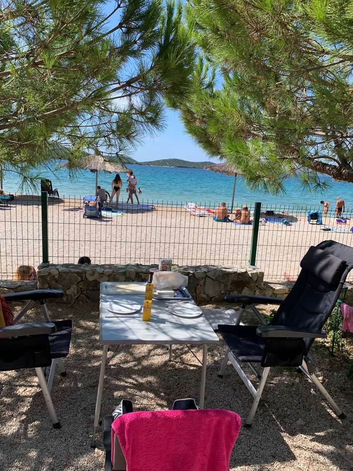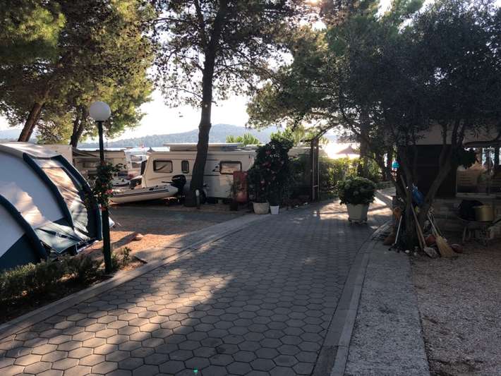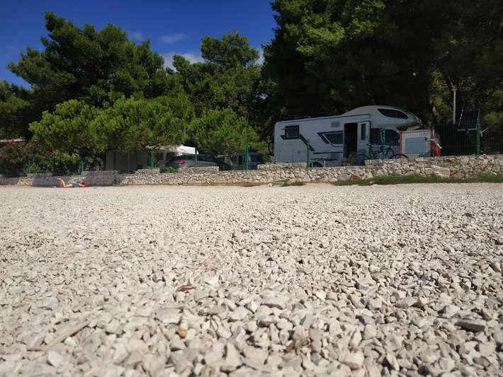 campeggio lungo la strada principale - leggermente in pendenza, con piazzole spaziose - adatto a tutte le dimensioni - proprio sulla spiaggia, bar e panetteria, senza ristorante - centro 2 km