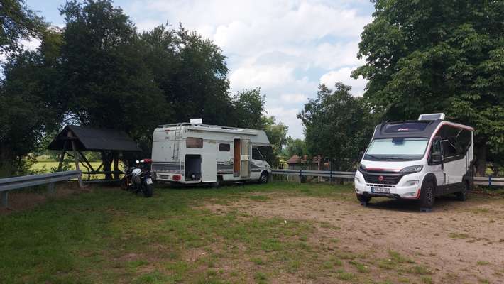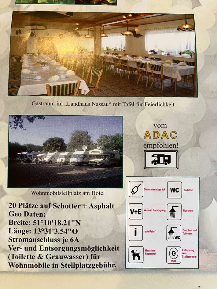 vriendelijk ontvangen, kleine camperplaats bij het hotel, wij betaalden €17,00, 2 personen incl. elektra en gemeentetax, voor sanitair betaal je €2,00 p.p. p.dag, betalbaar eten in het restaurant, Elbe en oude stad op 3km.
