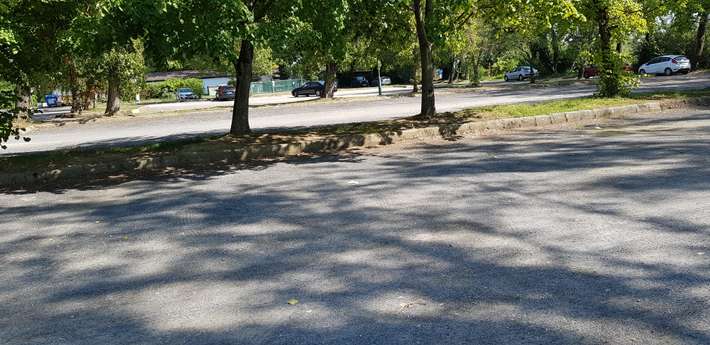 parking op asfalt voor het strand - gebruik GPS-coordinaten - onder bomen - aan het meer - centrum 500m