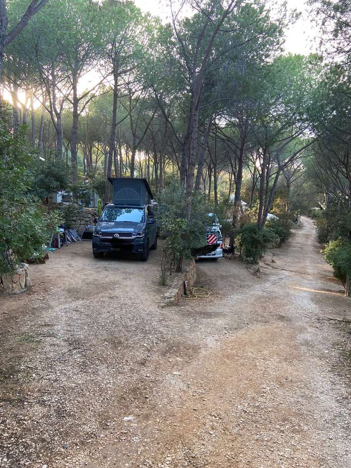 Kampeerplaatsen - tarief naar lengte camper - diverse periodes - terrassen tussen pijnbomen - parkeerplaatsen voor busjes, VW-bussen - centrum Orosei 8km