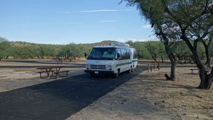camping met warme douches en nieuw sanitair - op de overflow ringground (1-1 tot 31-3) 15 dollar, op A en B 20 dollar zonder elektra, 30 met elektra - picknicktafel - BBQ-grill - centrum 11,5mls[25km]